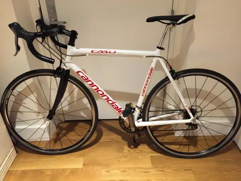 2009 Cannondale CAAD9 5 — white with red logos. Says “ultra” on the black fork, and “handmade in USA” on the side. Has a black Syncros seat with a white stripe where the Syncros logo is. Has a black pouch under the seat.
