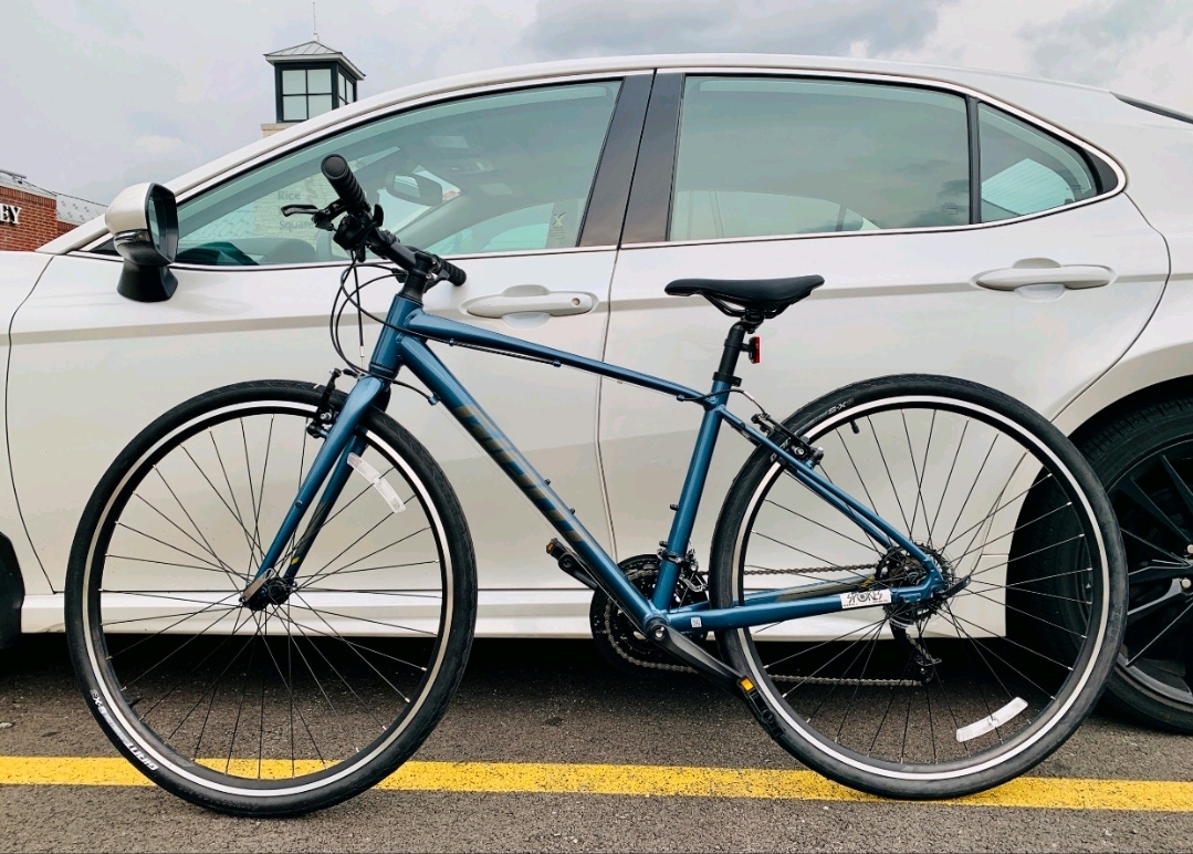 The bike as a sticker of "Spokes". it has a black kickstand and water bottle holder.