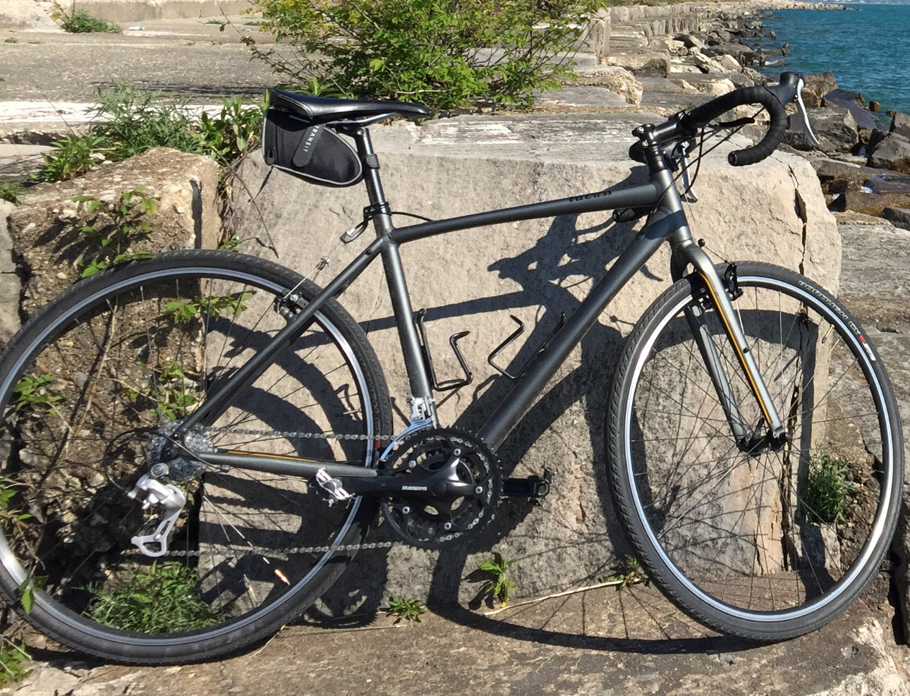 Specialized Tri-Cross bike. All black/matte black. Scrape by name of bike. Had pack underneath seat for emergency supplies.
