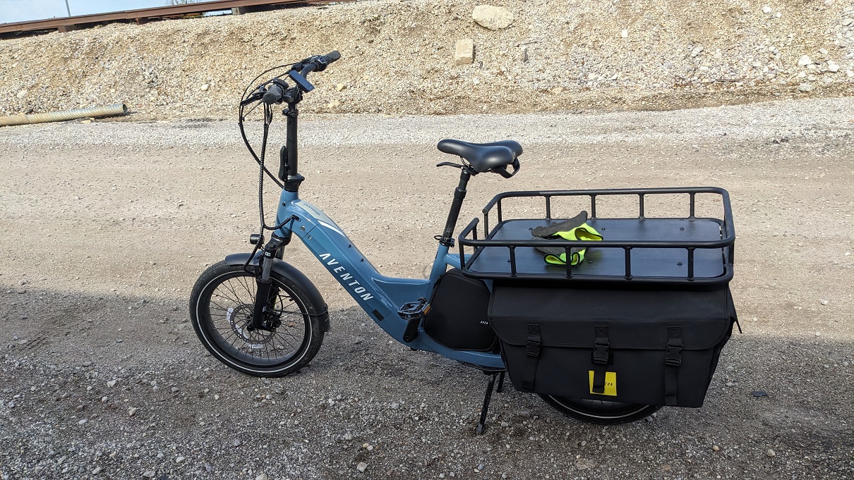 Aventon Abound ebike, blue with rear panniers and front/rear racks. Bags contain 3 Chicago Public Library books. Bar Mitts hand protectors on handlebars; lock in frame bag.