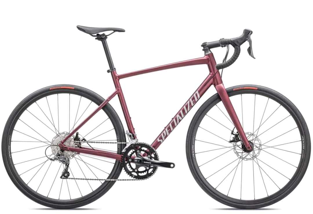 The bicycle is in almost-new condition, with no real distinguishing features. It is a 2025 model Specialized Allez road bike in "Satin Maroon/Silver Dust/Flo Red" color. Black grip tape. No modifications to pedals. The bike closely resembles the catalog photo above, except with normal pedals, not clip ins, and a black/gray bottle holder attached to the frame